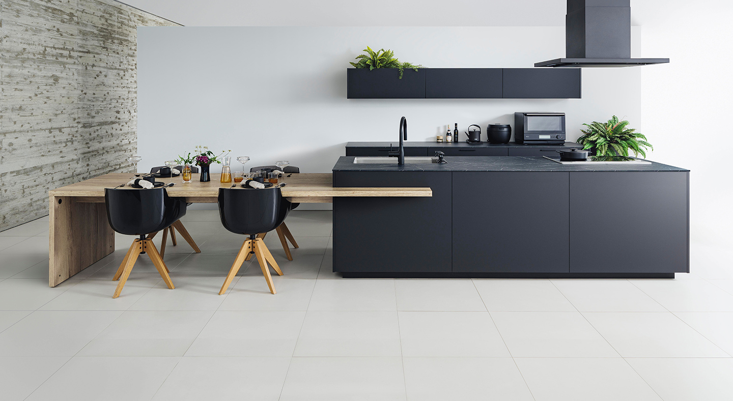 また、品質にもこだわりがあり、木口材を三重貼りにしてワークトップへの水の浸入を防ぐなど、見えにくい部分まで配慮が行き届いた設計になっています。もちろんデザインも魅力的で、エバルト天板も含めた全体を同色でそろえることができ、キッチンそのものがオブジェのような印象になります。